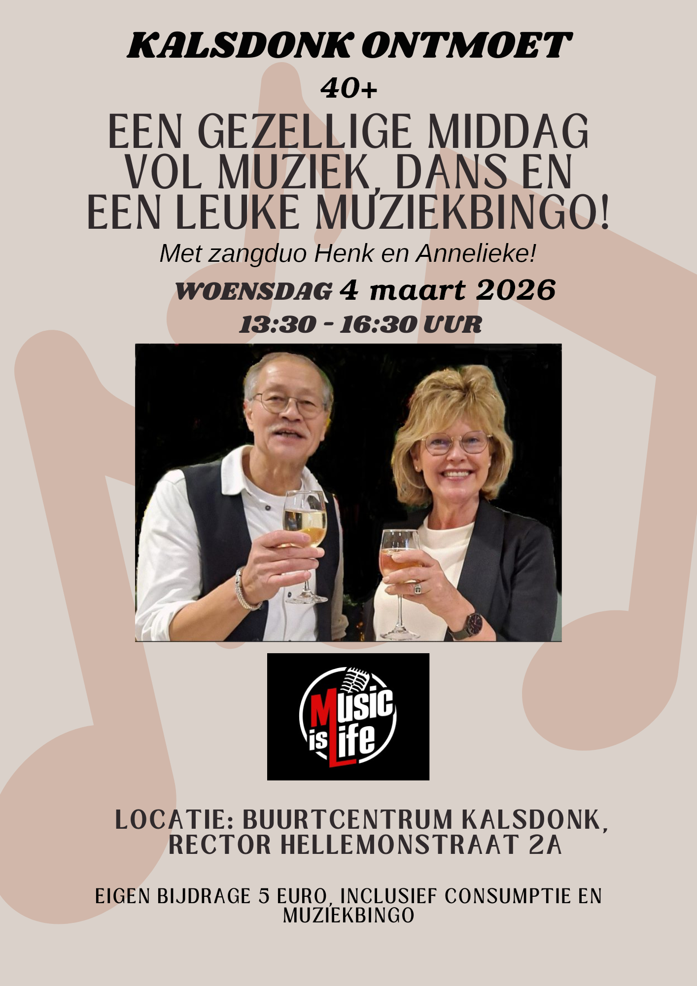 Woensdag 4 maart van 13.30u tot 16.30u, eigen bijdrage is 5 euro inclusief consumptie en muziekbingo.